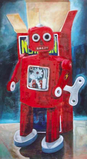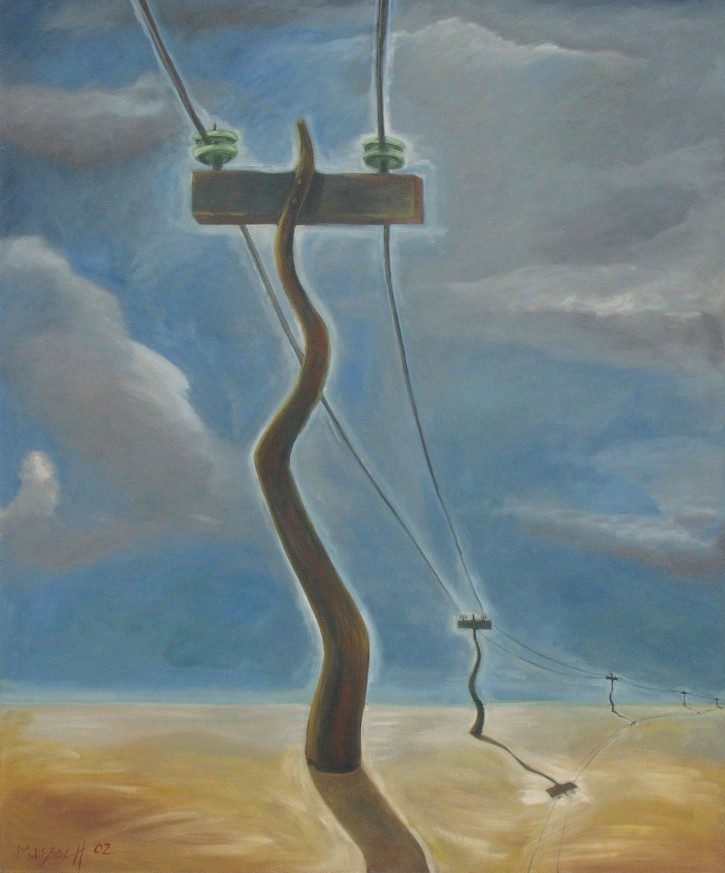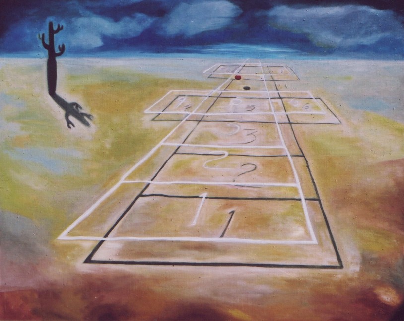 In his paintings Wiebach shows us a desolate universe in which the human figure is absent, but we see it represented by the same desolate desert landscapes which are partly testimony of his own existence. Within these surroundings we find paintings metaphoric of man’s evolution sometimes represented by innocent objects such as old roller skates or little robots which stand like silent witnesses of the destruction caused by man’s own supremacy. When ever we see a human figure among the paintings it is represented as a mere shadow or silhouette, just another object within the painting.