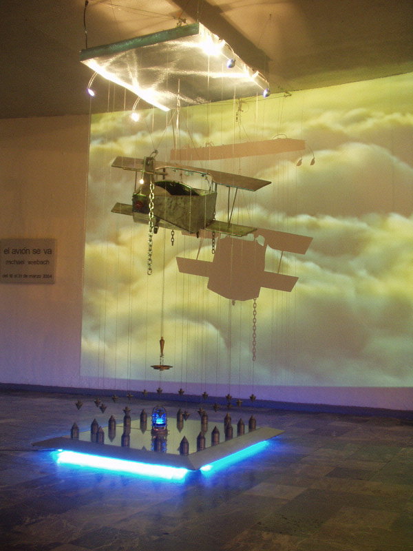 The precision of a pendulum hanging from a string has delineated the architecture of ancient cities and monuments. Throughout the exhibit inverted pendulums warn us about the necessary opposition of extremes and the indispensable existence of weightless intermediate space. Perhaps from the pendulum hangs time, in its continuous movement of a helix cycle which transits and returns to its origin by necessity. The child’s game of hopscotch (el avioncito in spanish) is reconstructed in the tidy installation which recalls the absurdity of its nature. A paradox is created, of an immensely heavy object which flies, in a realm where technology is an attainable dream. Michael Wiebach’s plane is a small toy which has liberated itself from it’s yoke. It flies always in the same place, measuring time not distance, reflecting on itself, breaking its chains and beginning to float.