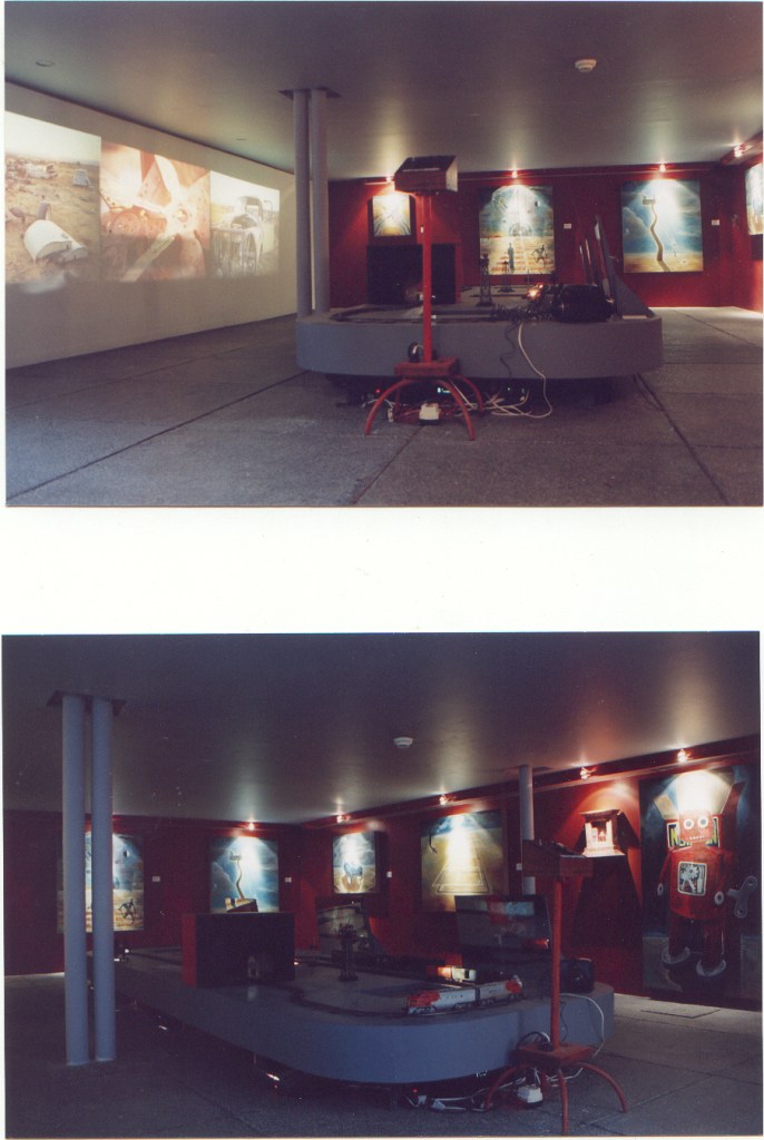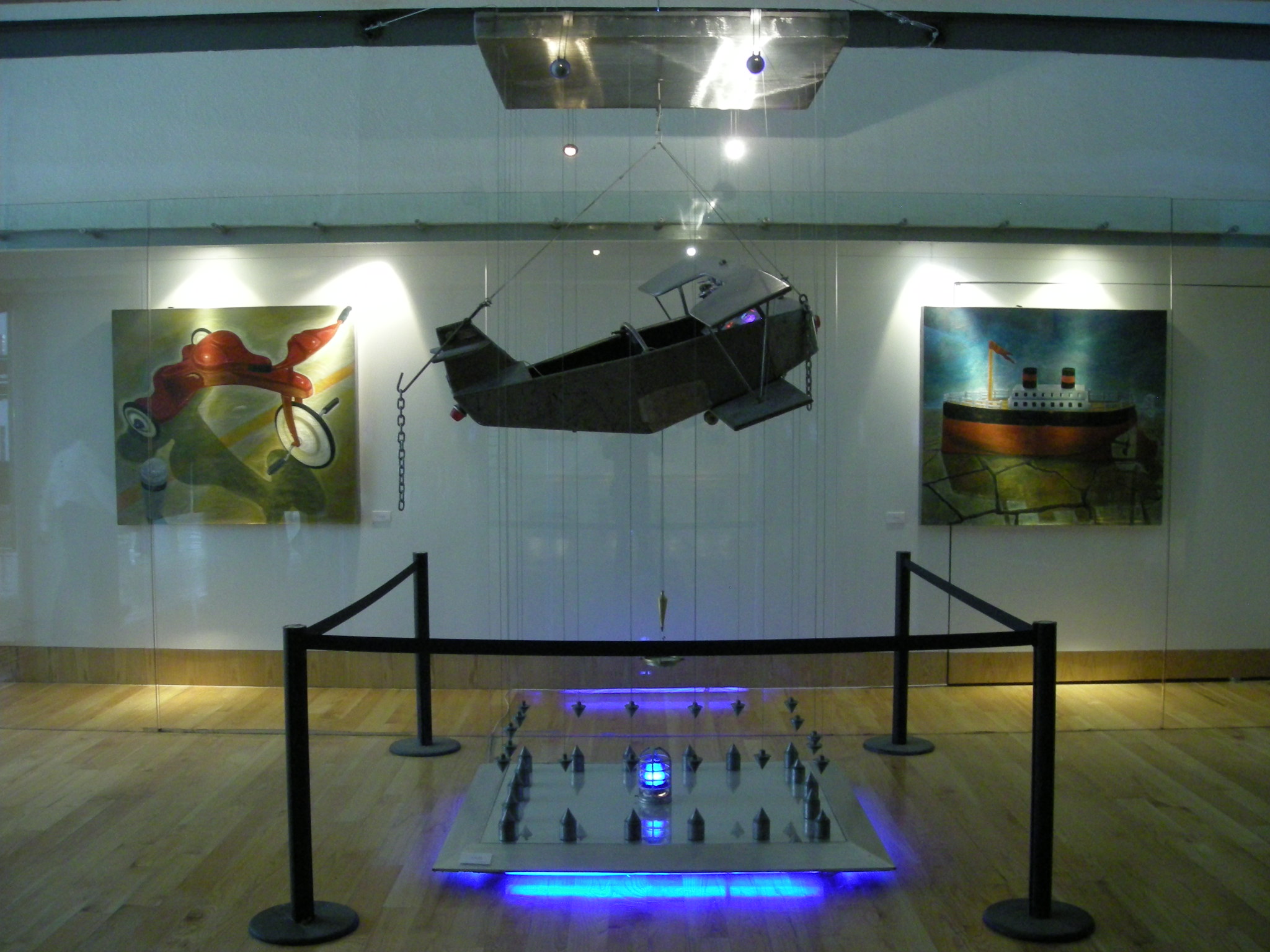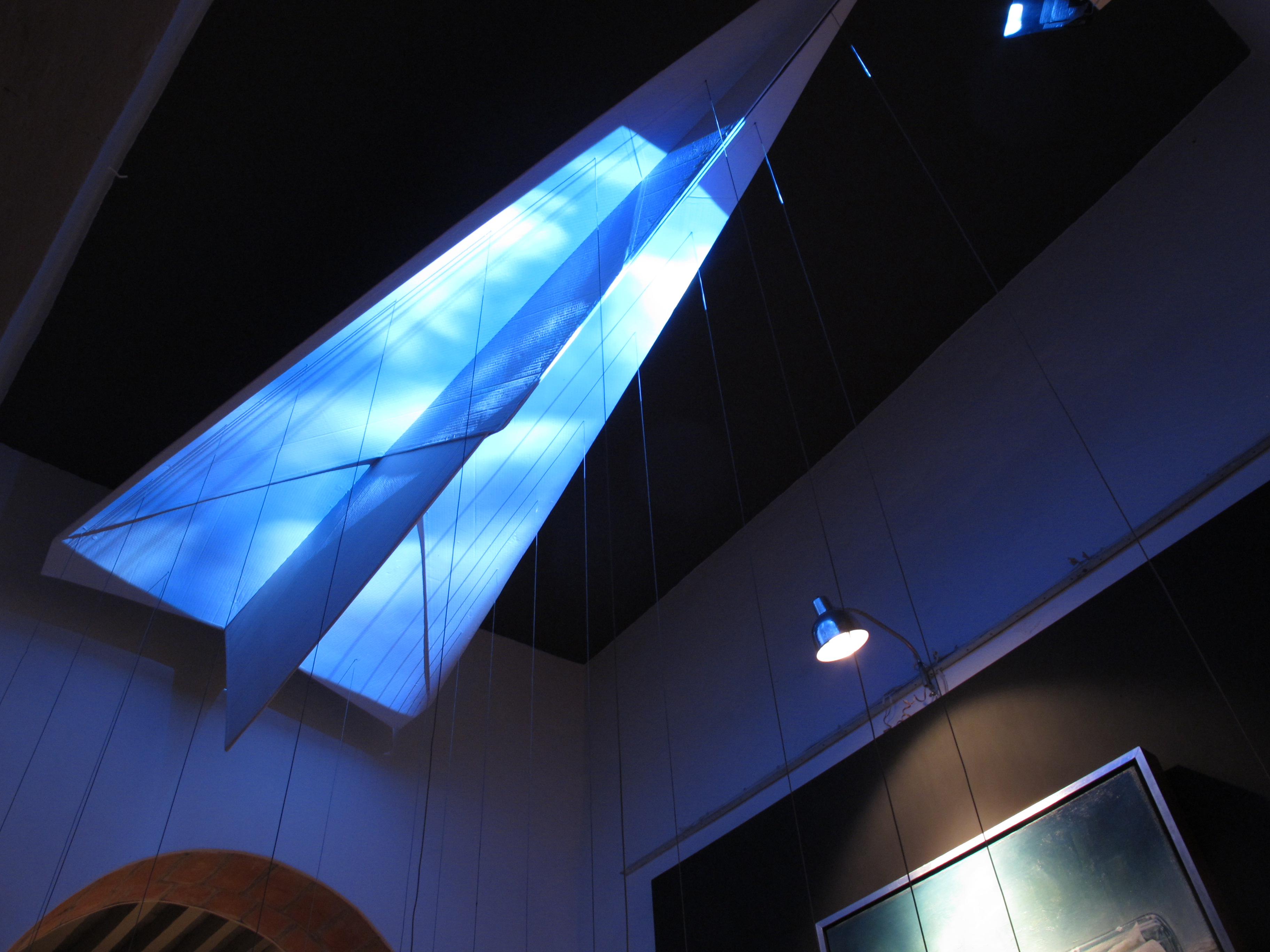 The seasickness is intentional; it is the levitation of beings and paintings, the creation of an environment without gravity, the destiny of recollected and re-contextualized objects, the playing and the working of light. Time, movement and an inverted ego, are metaphors worthy of both sides of the brain.