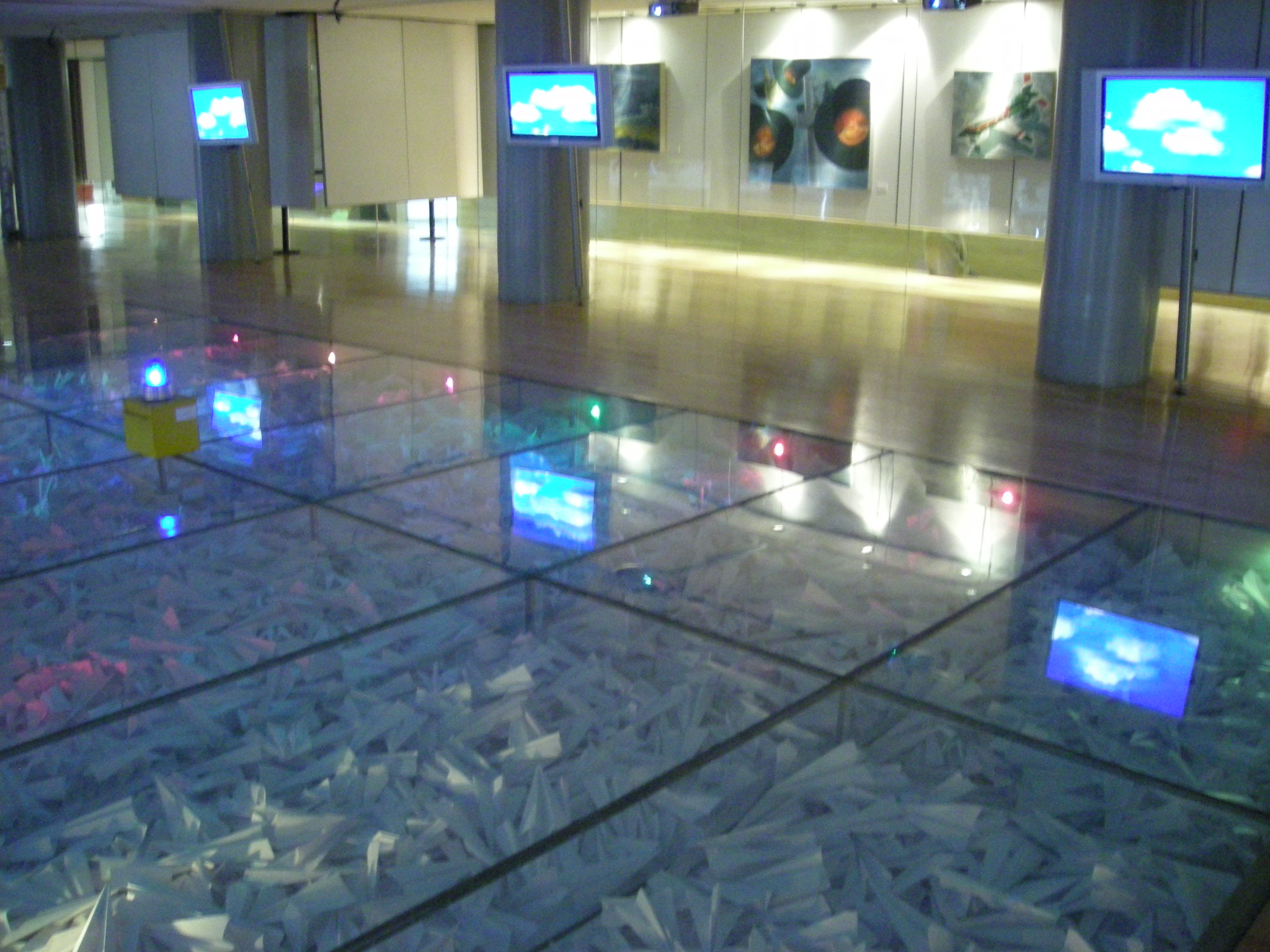 The video-installation “Elevation” plays a fundamental part of the visual atmosphere. The spectator is taken through an environment where multiple projections, (some upon the floor) create a sense of “walking over clouds” and the other images on 8 large widescreen TVs suggest aerial movement over horizon clouds, simulating airplane windows, all of this creating a sense of flight.