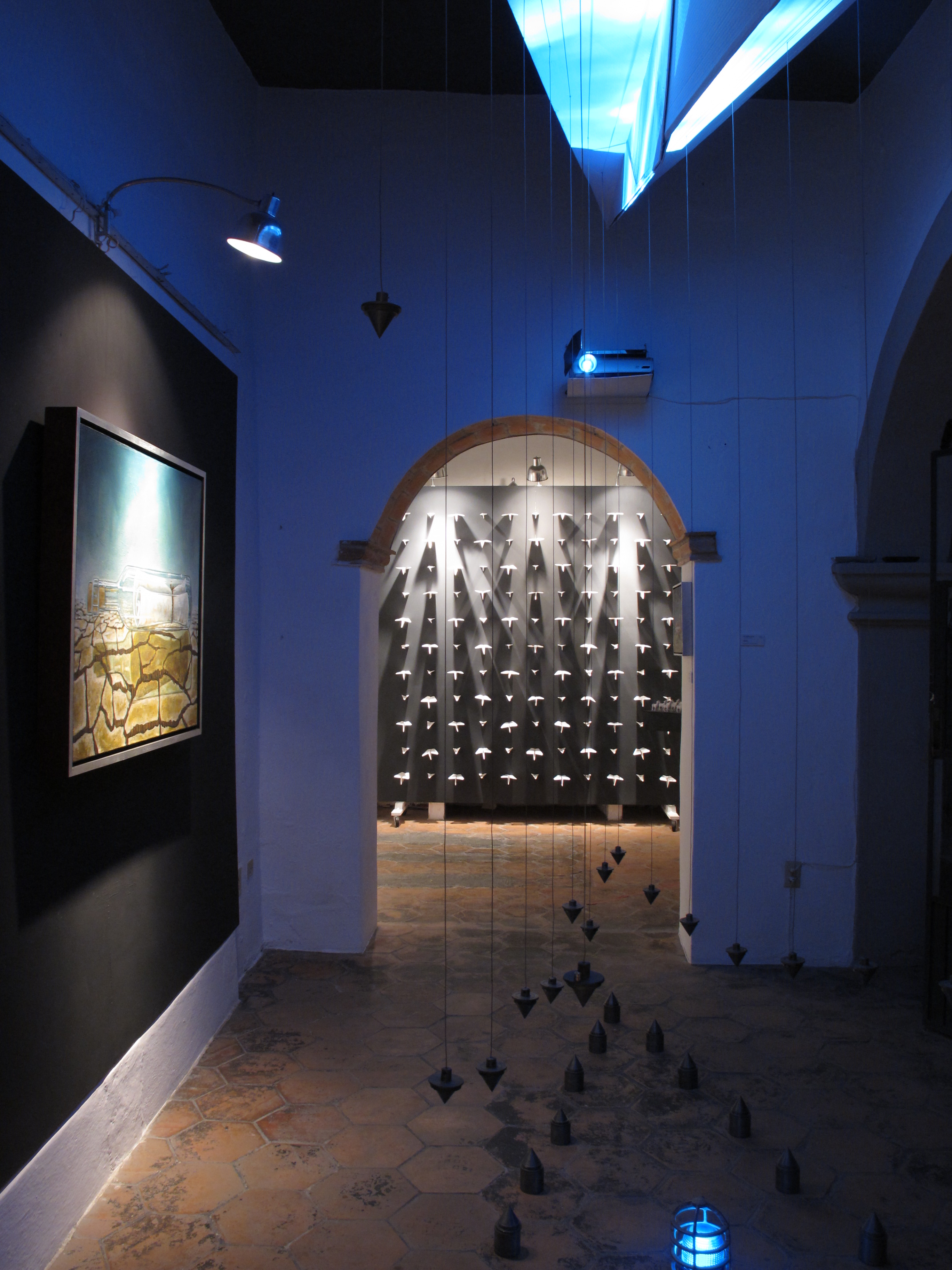 The creative process begins with the collection of old, discarded objects, which suggest coincidental encounters where careful selection, along with impeccable restoration work and the force of electro-mechanical gadgetry, show an interest in creating a complete visual ambient. The paintings suspended at a distance from the walls, transcend the order imposed by the walls themselves. As such, they express distinct aspects of urban nature, as in the artists’ previous exhibit Adonde nos Lleva el Tren in which he used a palate of yellows, blues, grays and reds. A desert in which violence adheres to metal. Bad timing is measured with the light that defines the limits between earth and sky., the minimum space marking the horizon.